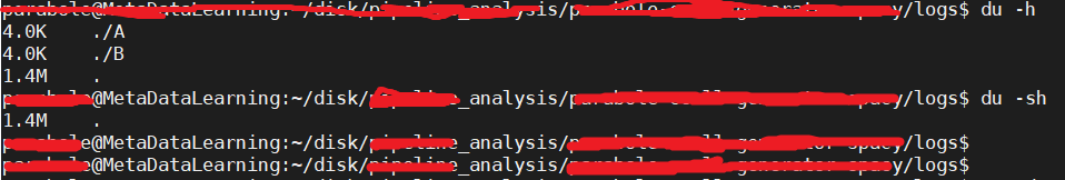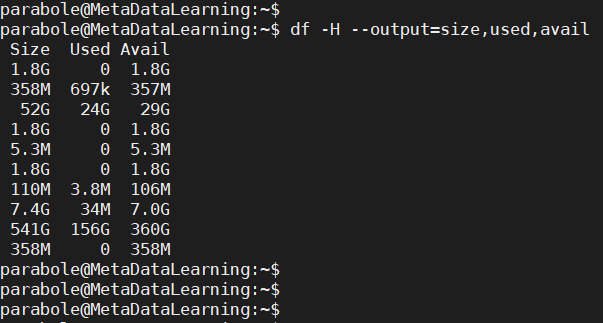 The following is a snapshot of both the commands with their output. Combined with different arguments the df and du output can be formatted in many ways. For instance, the following displays only size, used and available.